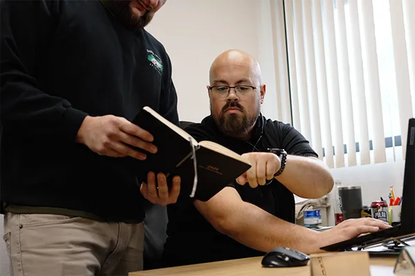 Brandon is sitting in the office at a computer, pointing at something in a book that Anthony is holding.